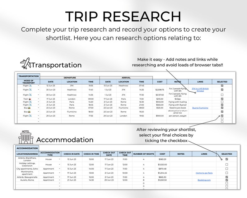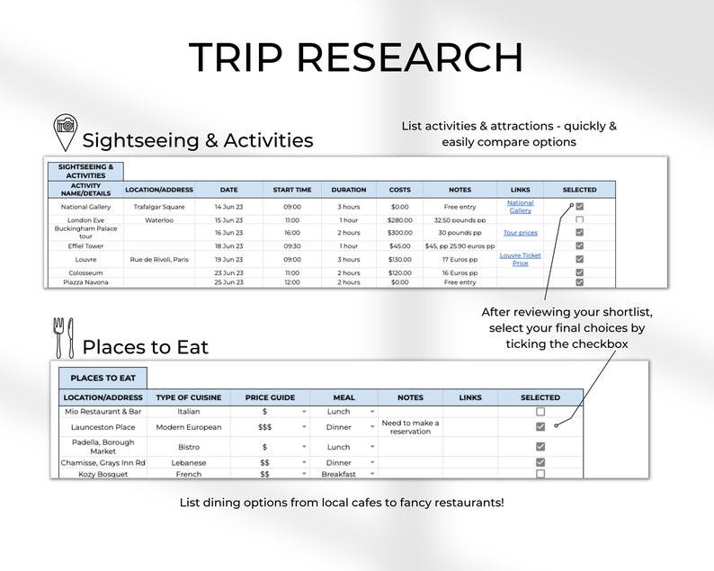 Trip Research Sheet – A space for you to record all your plans for your trip. This page is split into the following sections – Transportation, Accommodation, Sightseeing & Activities and Places To Eat. When researching your trip you can record potential options relating to each section in this sheet, essentially creating a shortlist for each section. You can select your final options here too by ticking the checkbox (see images for more).
