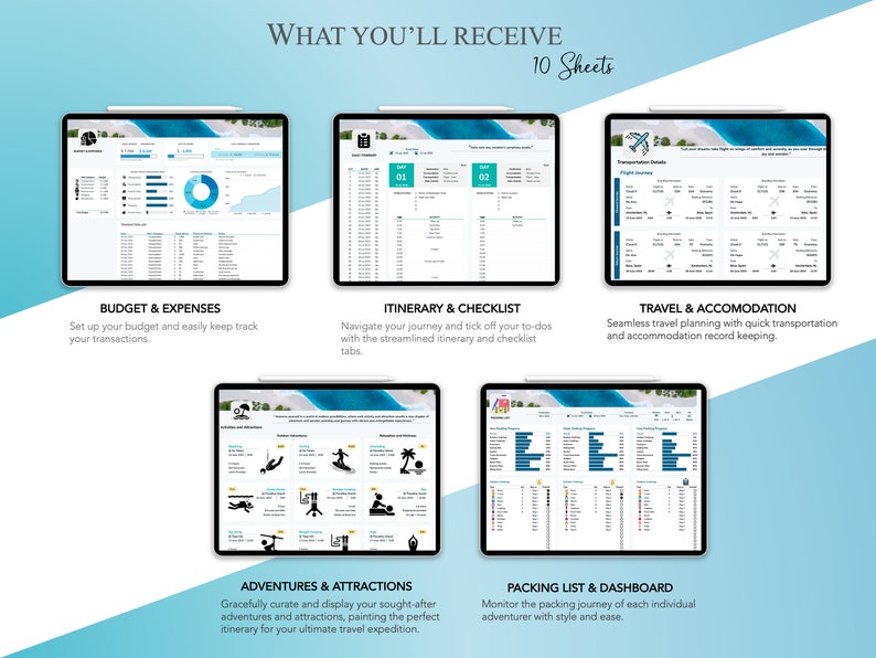 Embark on a seamless and unforgettable journey with our ultimate travel planner. Designed to enhance your travel experience, our comprehensive vacation companion encompasses every aspect of the trip organization. From creating a detailed itinerary and managing expenses to packing smartly and documenting your adventures, our travel planner ensures you stay organized and focused on your wanderlust. With features such as budget and expense tracking, daily trip itineraries, checklists, packing lists, transportation and accommodation management, activity planning, and even a “What’s in My Bag” view, our planner covers it all. It’s suitable for various trips, including family vacations, weekend getaways, honeymoons, digital nomad journeys, work trips, and bucket list adventures. Capture your travel memories and experiences with the included travel journal, allowing you to document your journey and create lasting memories.