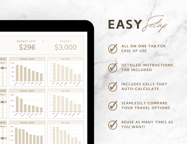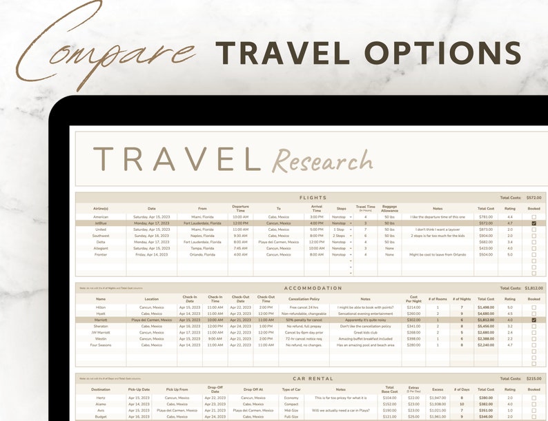 Plan the trip of your dreams whilst staying on budget with this all-in-one trip planner for Google Sheets. Featuring a soothing aesthetic, it is intuitive, ready-to-use and easy to customize in Google Sheets, allowing you to effortlessly manage your travel budget and choose the best options. Condensed into a single tab so no more fumbling across multiple tabs trying to find key information. Perfect for individuals, families, groups, or business travellers, this user-friendly tool allows you to easily set a budget, track your spending, and seamlessly compare flight, hotel, car rental, and other travel options! Get your copy today to say goodbye to travel planning headaches and ensure you book the best vacation possible at the most affordable price!