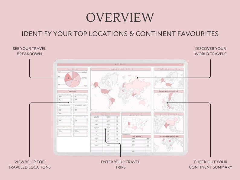 Managing your travels, bucket lists, and travel experiences is now easier than ever with our all-in-one TRAVEL TRACKER WORLD MAP SPREADSHEET, created specifically for use with GOOGLE SHEETS. This dynamic tool empowers you to document, plan, and reflect on your adventures with tailored features to suit your wanderlust. Personalize your travel goals, track your journey with visual progress, and organize future trips with easeall in one place.