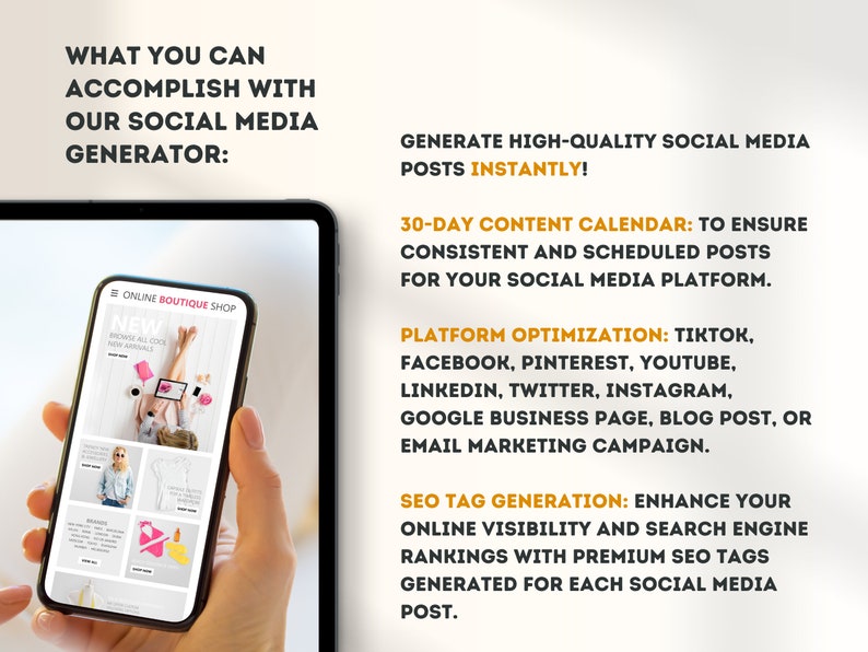 We understand the importance of planning and consistency in social media marketing. That’s why we provide you with a 30-day content calendar, taking the guesswork out of your posting schedule. With a pre-planned content strategy, you can focus on what you do best while maintaining a consistent online presence. To further enhance your brand’s visibility and reach, our tool generates premium SEO tags for each social media post. These tags are carefully crafted to optimize your content for search engines, helping potential customers discover your brand easily.