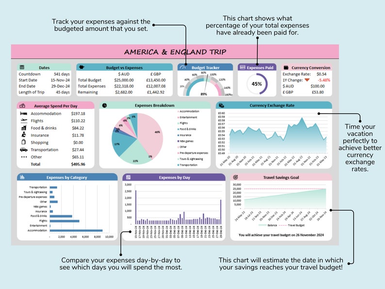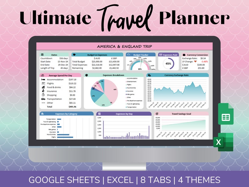 Start planning for your dream vacation with our user-friendly Ultimate Travel Planner! It contains many useful features in a sleek and stylish format. This is the spreadsheet you never knew you needed.