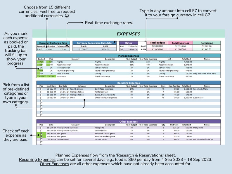 Check off expenses as they are booked/paid.