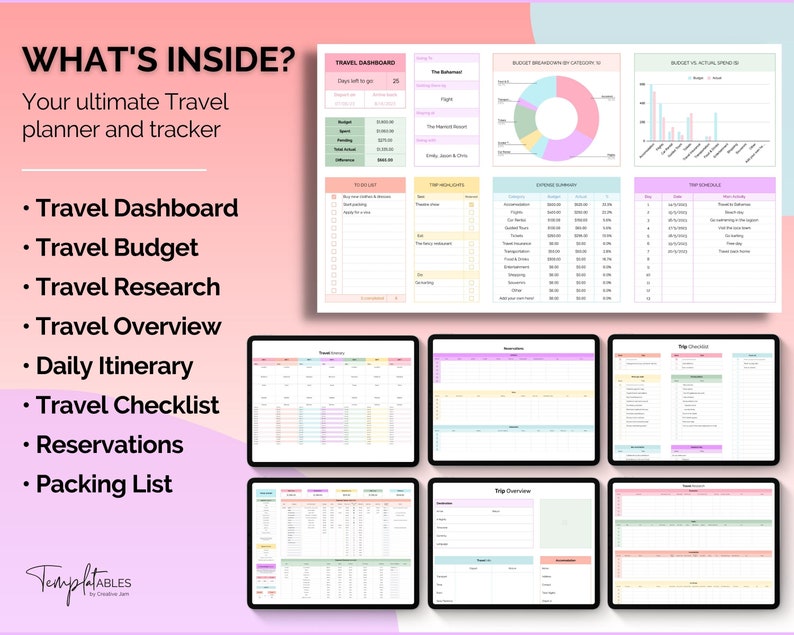 Digital Travel Planner Spreadsheet! Your ultimate travel planner, packed with automated travel budget calculators, travel itinerary templates, packing lists and everything else you need to plan your trip.