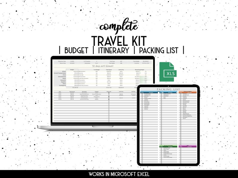 Excel Template: Instructions Tab, Dashboard Budgeting Tab, Printable Trip Details Tab, Printable Itinerary Tab, Printable Packing List tabs.