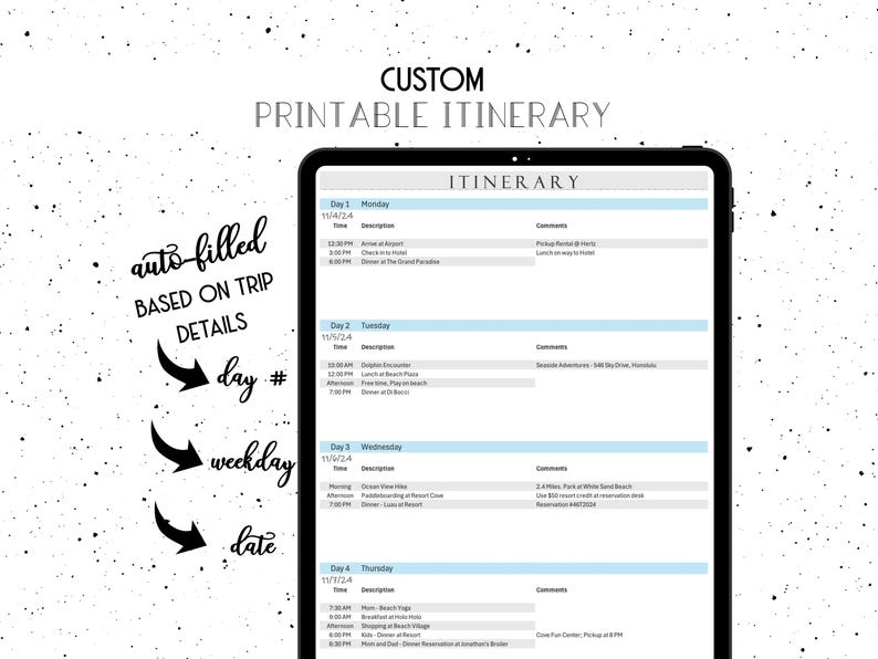 A fillable itinerary is auto generated based on travel dates, saving you time to plan each day of your vacation. A sample packing list is provided to help you remember everything you should take.