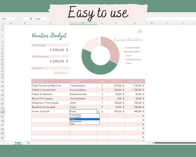 This Travel Budget will help you stay ahead of your finances during your vacation. You will be able to see how your money is alocated for your holiday. You’ll aslo be able to see quickly if you are going over your budget!